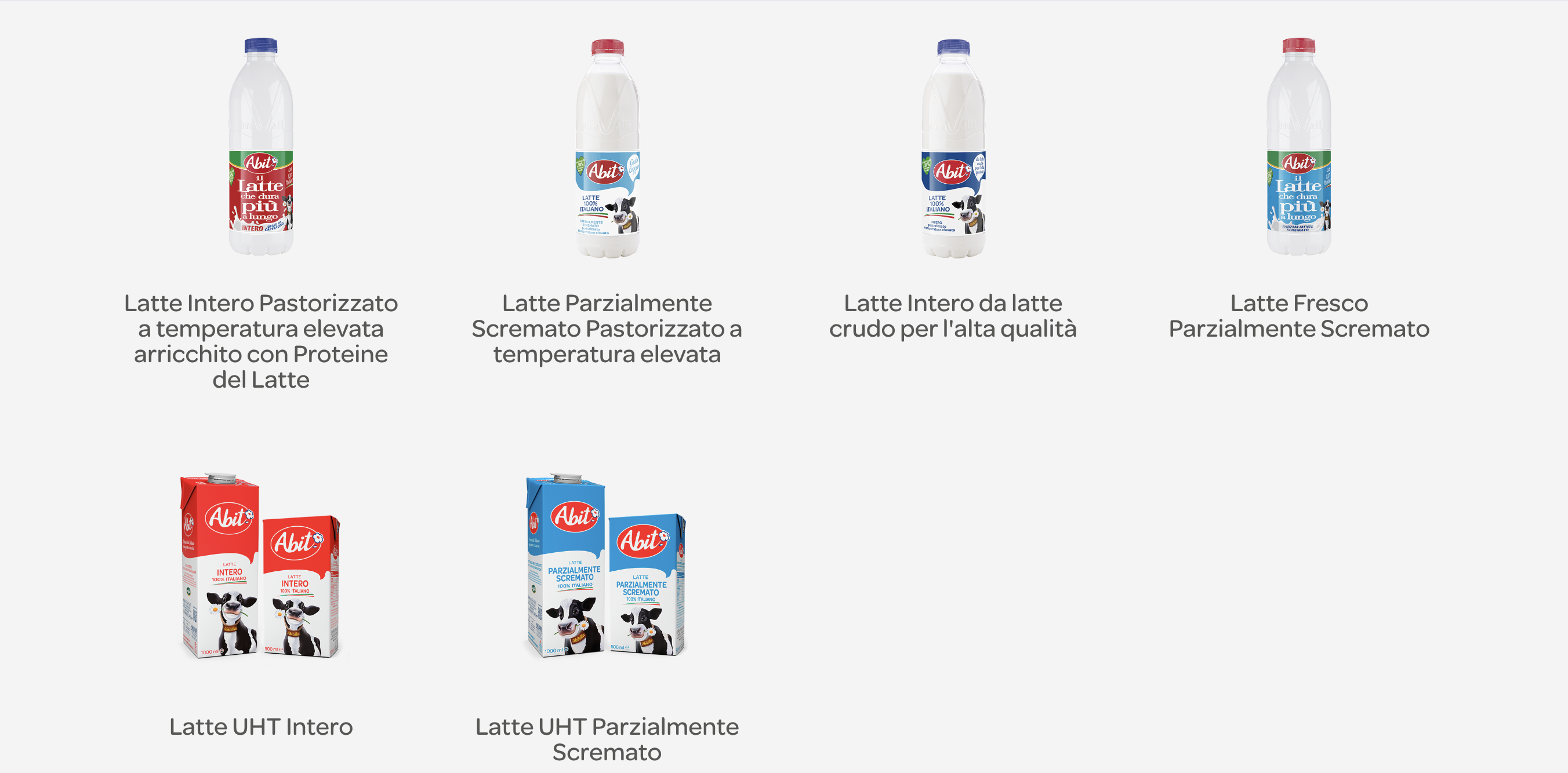Per soddisfare ogni esigenza ABIT propone una vasta gamma di prodotti, tra i quali: Latte fresco Alta Qualità, Latte a lunga durata, Latte UHT, Panna, Burro, Formaggi Freschi e Yogurt.