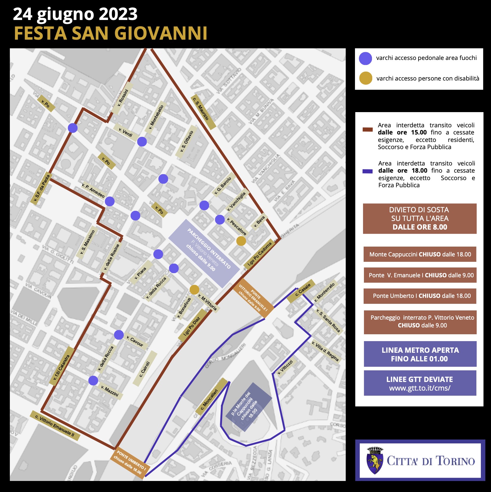 Dalle ore 15 di sabato 24 giugno e sino a cessate esigenze, e comunque sino a quando sarà rilevata presenza di pubblico, sarà vietata la somministrazione, la vendita, il consumo e la detenzione in luogo pubblico per asporto di bevande con contenitori idonei all’offesa della persona nelle vie racchiuse all'interno dell'area perimetrata dalle seguenti vie: lungo Po Cadorna; lungo Po Diaz; corso Cairoli; corso Vittorio Emanuele II (tratto compreso tra corso Cairoli e via della Rocca); via della Rocca (tratto compreso tra corso Vittorio Emanuele II e via Maria Vittoria); via Maria Vittoria (tratto compreso tra via della Rocca e piazza Carlo Emanuele II); piazza Carlo Emanuele II; via Maria Vittoria (tratto compreso tra piazza Carlo Emanuele II e via San Francesco da Paola); via San Francesco da Paola (tratto compreso tra via Maria Vittoria e via Po); via Po (tratto compreso tra le vie San Francesco da Paola / Vasco e piazza Castello); via Verdi; corso San Maurizio (tratto compreso tra via Verdi e lungo Po Cadorna).