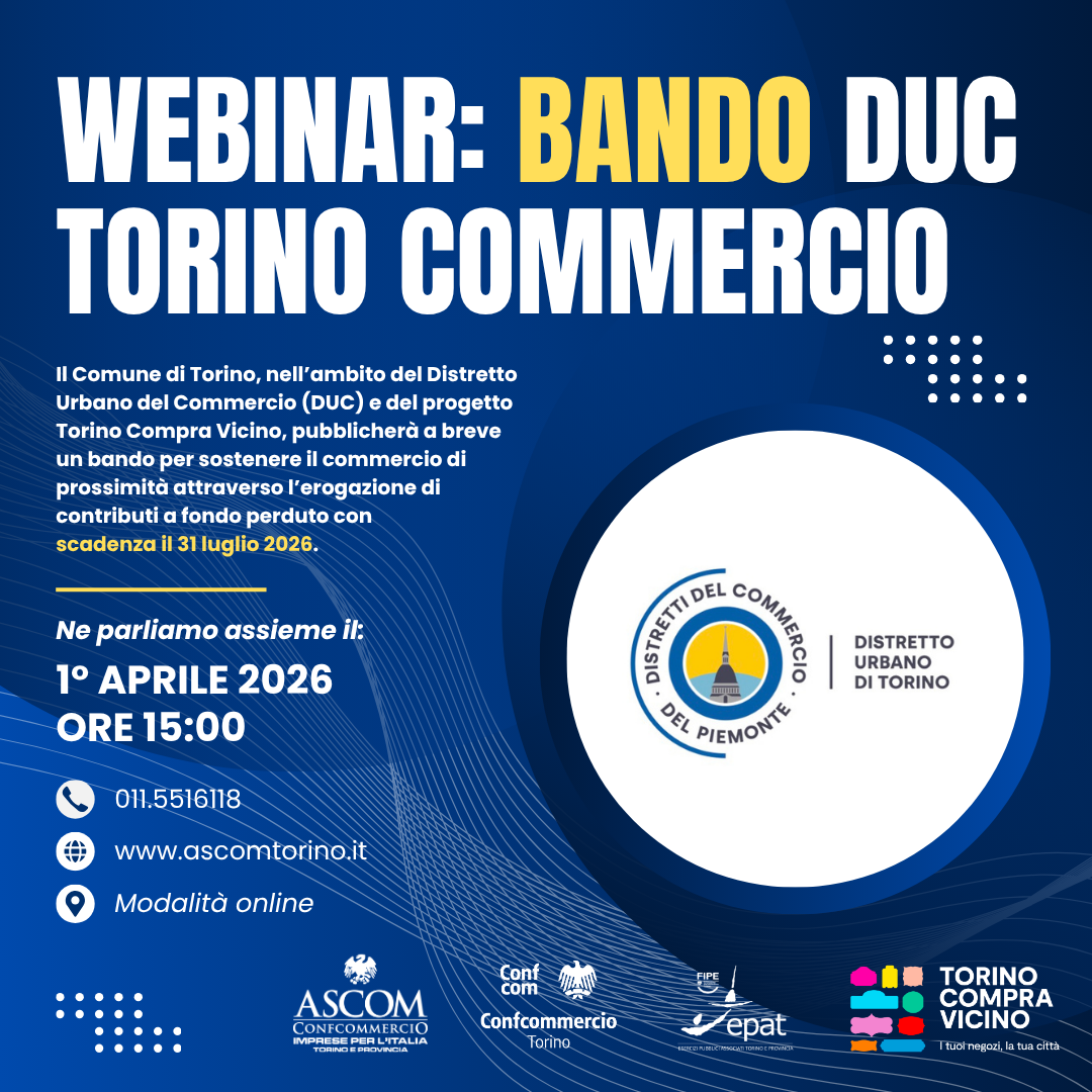 Per accompagnare le imprese nella comprensione delle caratteristiche del bando e delle modalità di partecipazione, Ascom Confcommercio Torino e provincia organizza un webinar informativo in programma il 1° aprile alle ore 15.00. L’incontro sarà un momento utile per chiarire i principali aspetti operativi e rispondere alle domande degli operatori interessati.