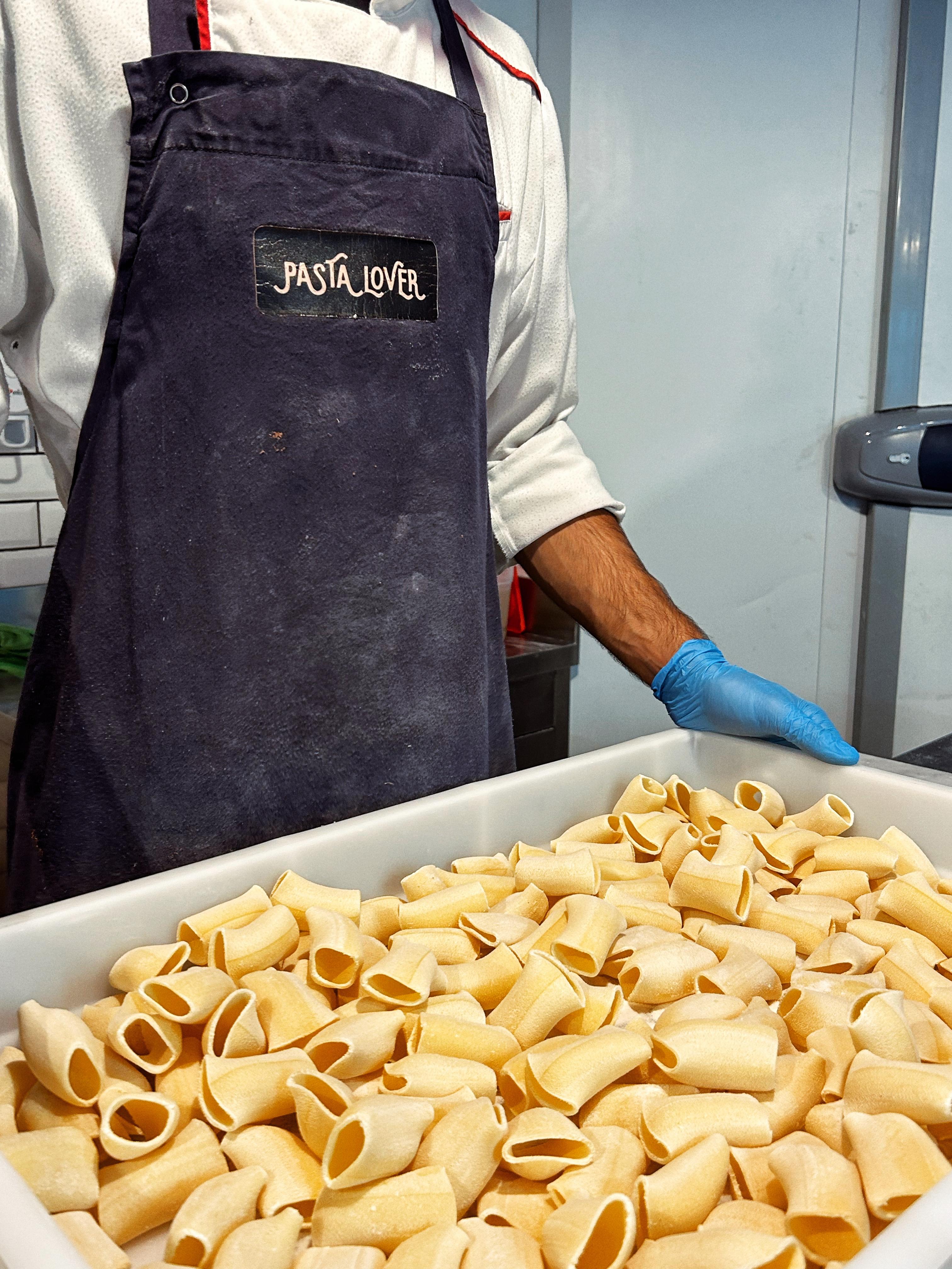 Appena si entra, non è solo il gusto a essere coinvolto: un intenso profumo di farina accoglie i clienti, anticipando l’esperienza culinaria. Al mattino, è possibile osservare la preparazione della pasta fresca nel laboratorio a vista di Via Madama Cristina, dove i pastai preparano con cura e amore diversi formati secondo la tradizione artigianale. Qui, la pasta non è solo il piatto principale, ma diventa un elemento che unisce, che riporta alla convivialità, al piacere di stare insieme a tavola.